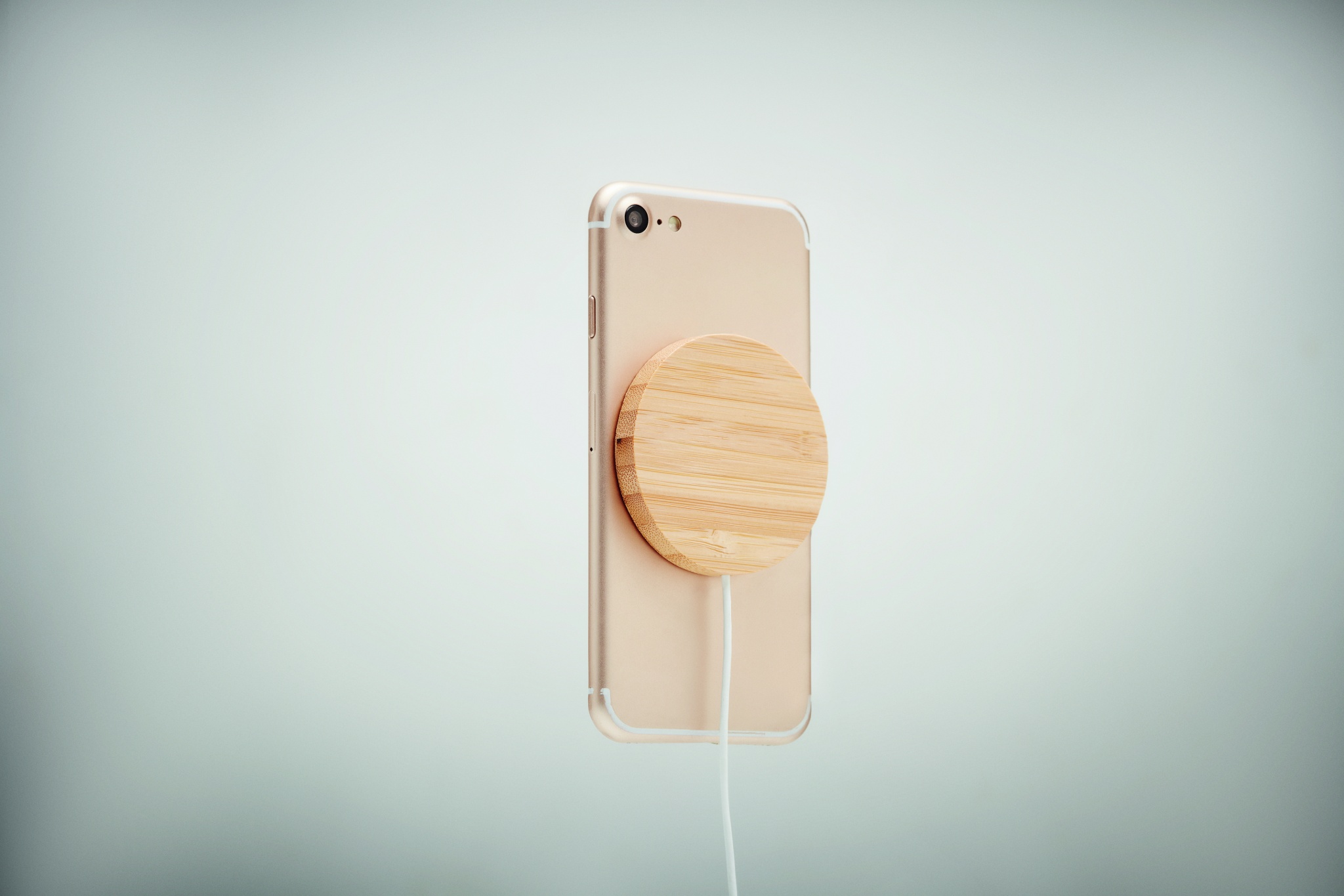Бамбуковое б/п зарядное устройство с магнитом. Выход: 9В АС/1,1А (10 Вт) для быстрой зарядки. Совместимо с iPhone® 12 и новее. Есть еще доп. магнитное кольцо для б/п зарядки других смартфонов