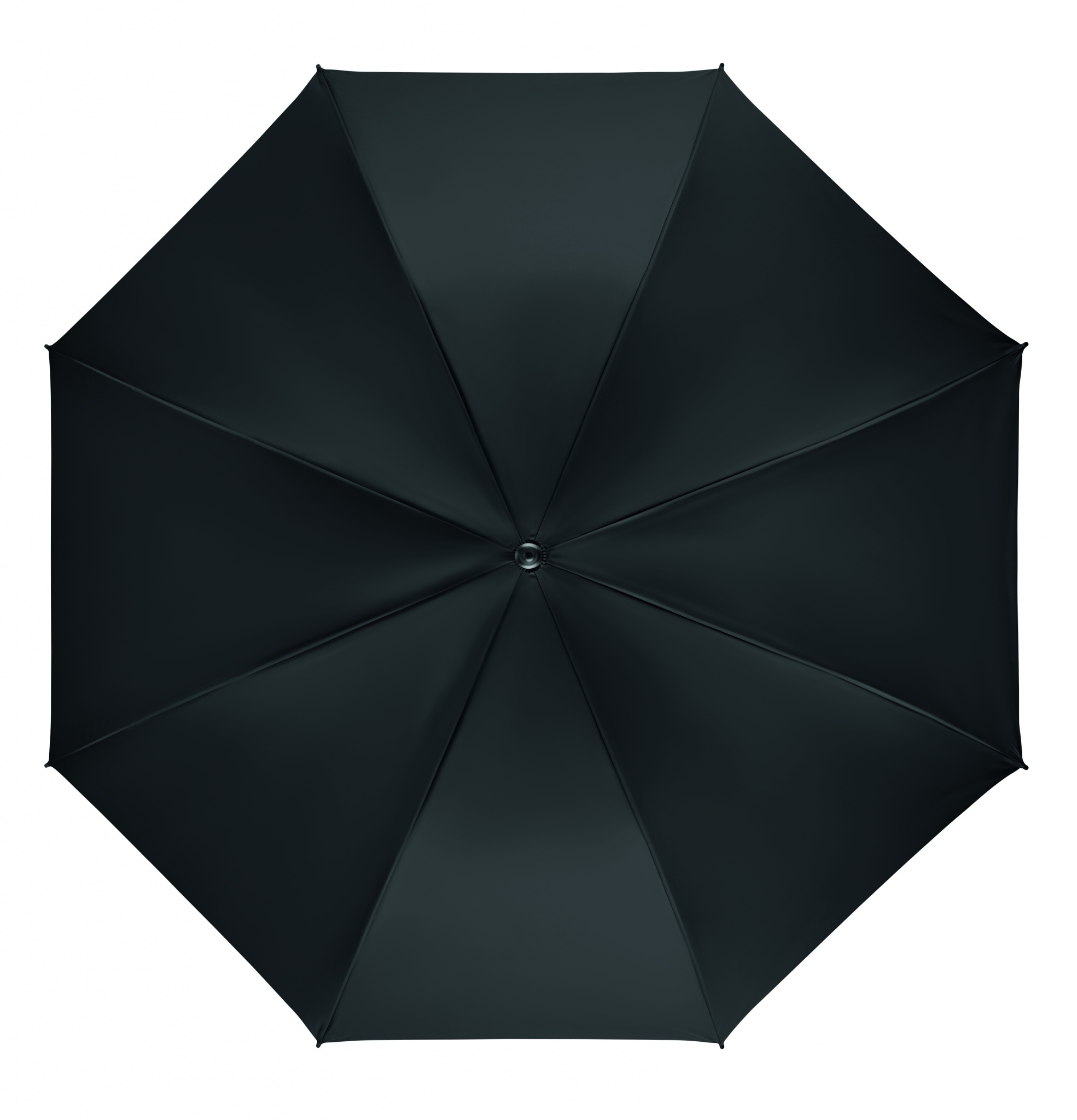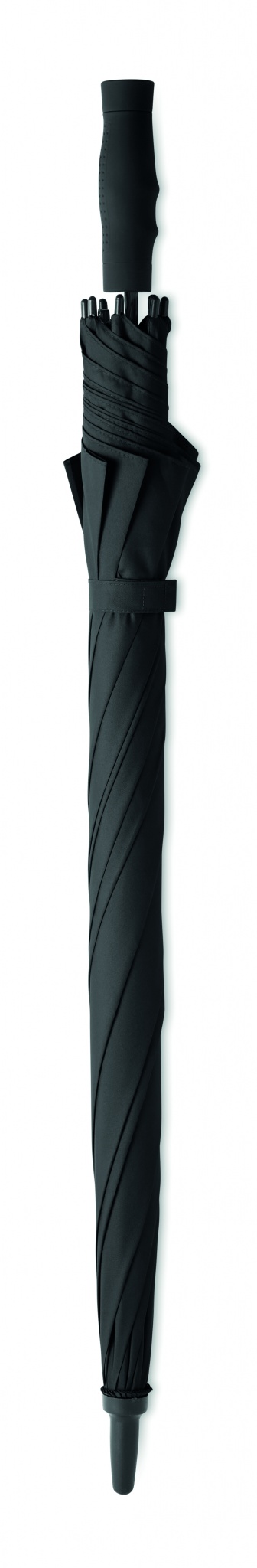 Зонт антиштормовой из эпонжа 190T со спицами и штоком из стекловолокна. Ручное открытие. Черные пластиковые наконечники и верхушка. Ручка ровная черная из пластика АБС, покрытие софт тач. Открытый купол диаметром Ø 116 см