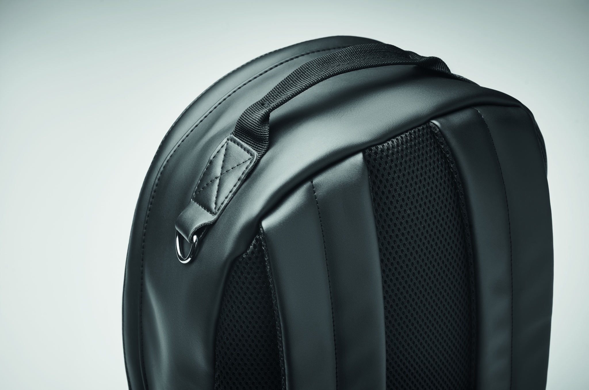 15 tums laptopryggsäck i mjuk PU med vadderad rygg och förstärkt botten. Ficka med dragkedja framtill. Fodret är 210D RPET.