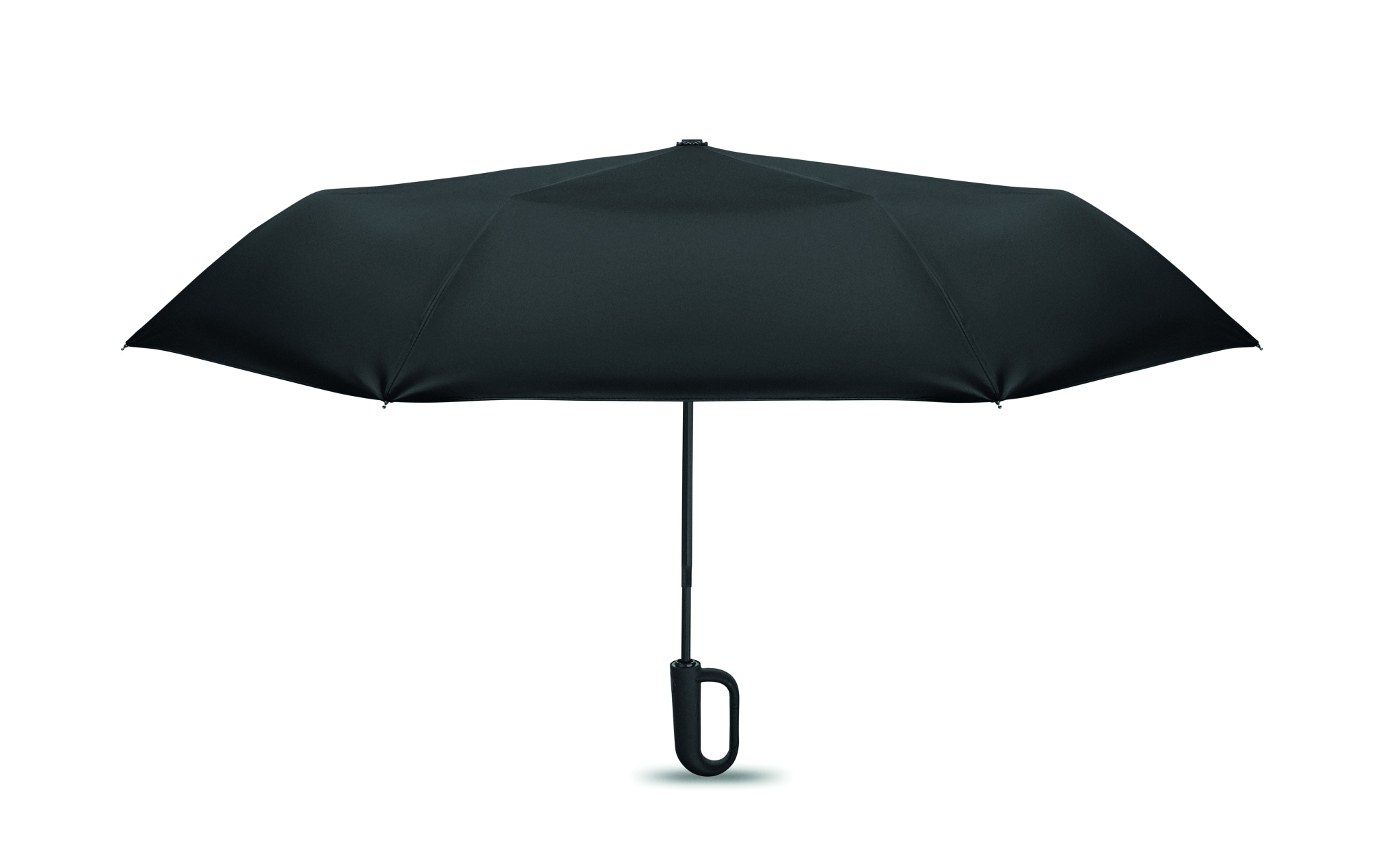 Vikbart 21'' vindtätt paraply med helt svartpläterad glasfiberram med 2 sektioner. Ribbor i glasfiber. 190T RPET pongee paneler. D-format karbinhakehandtag med gummifinish. Automatisk öppning och stängning. Inklusive påse