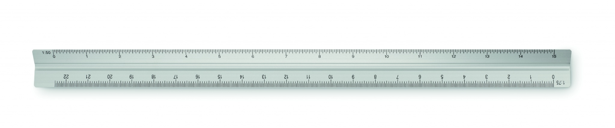 30 cm triangulär arkitektlinjal i aluminium. 3 sidor och 5 olika måttskalor. Skalor: 1:20/1:25/1:50/1:75/1:100