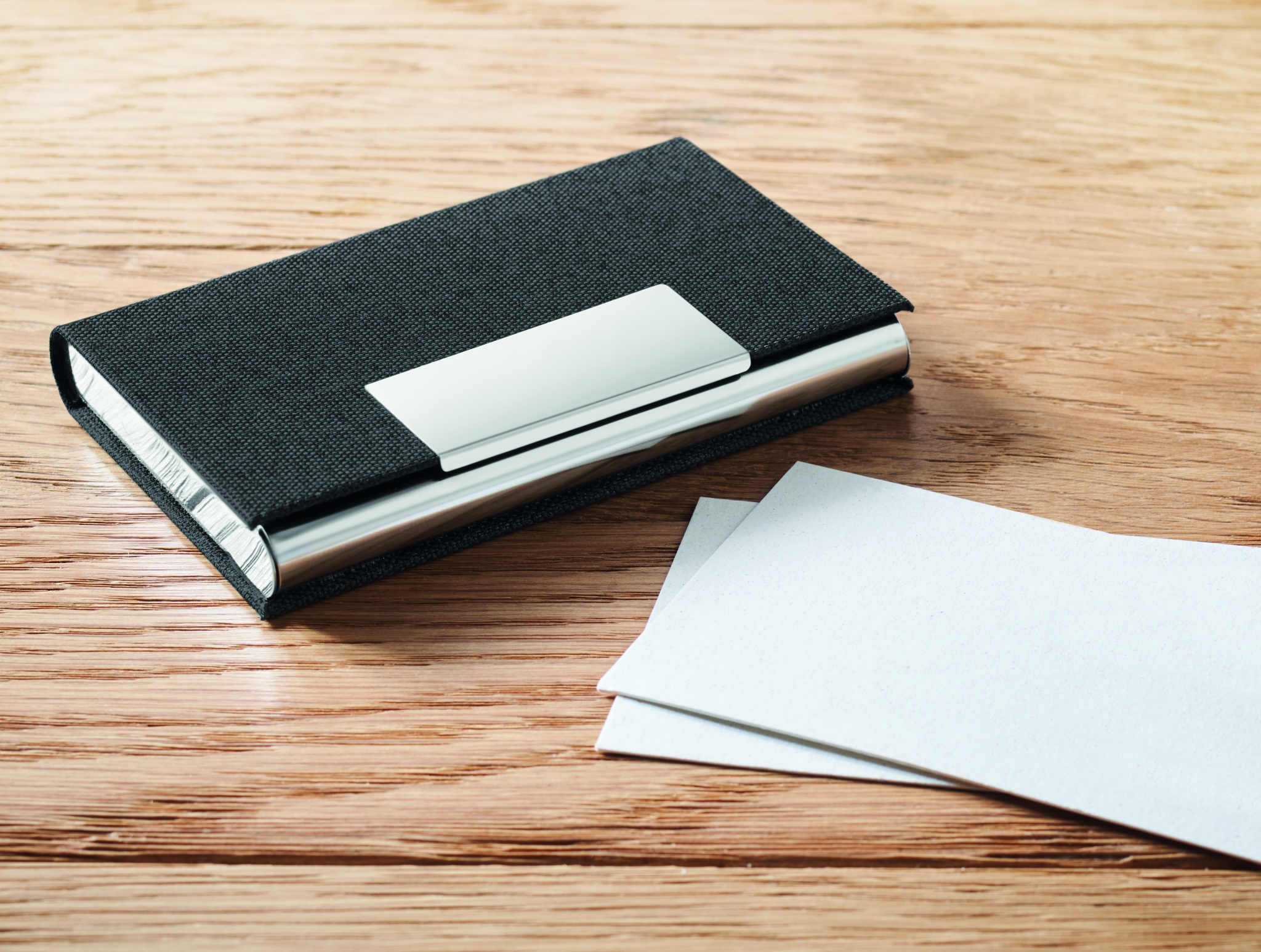 3-delat presentset. Innehållande kulspetspenna med vridfunktion i metall och RPET-polyesterdetalj, RPET-nyckelring i polyester samt RPET-korthållare i polyester med metallplatta. Blått bläck.