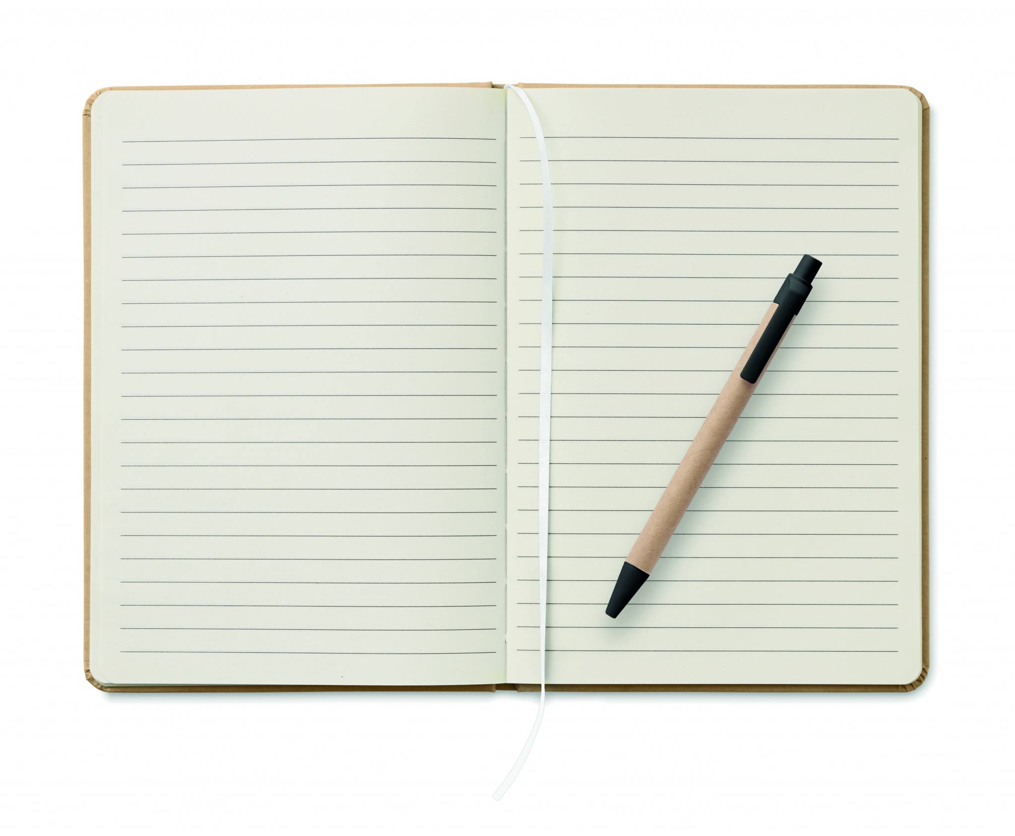 A5 anteckningsbok med omslag av hård återvunnen kartong. Inbunden med 160 linjerade sidor (80 ark återvunnet papper). Elastisk stängsningsband och pennhållare, sidomarkeringsband. Inklusive penna med kropp av återvunnet papper. Blått bläck