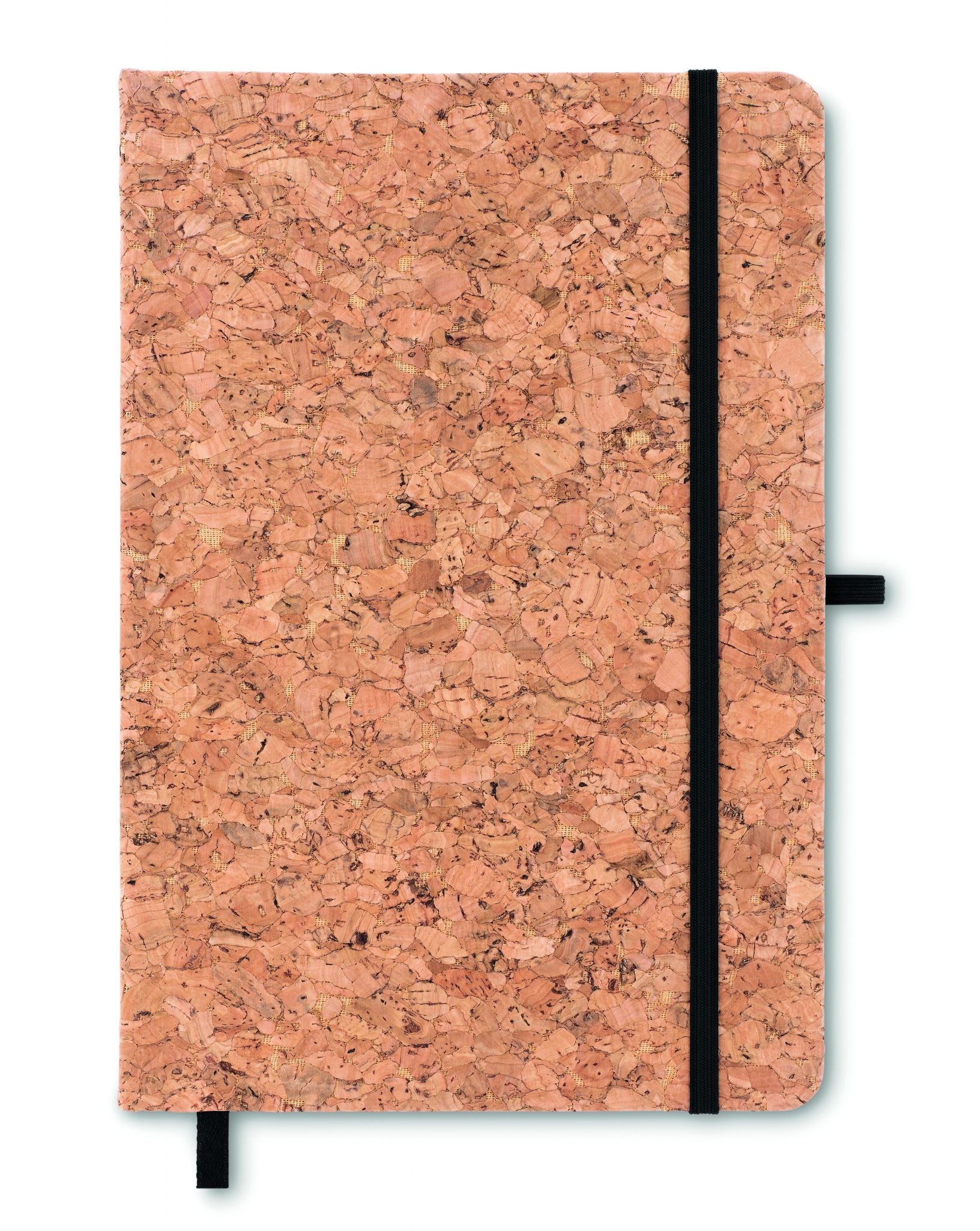 Anteckningsbok A5 med 96 st linjerade sidor med omslag i kork, band för penna, bokmärkesband och elastiskt band för hålla boken stängd.