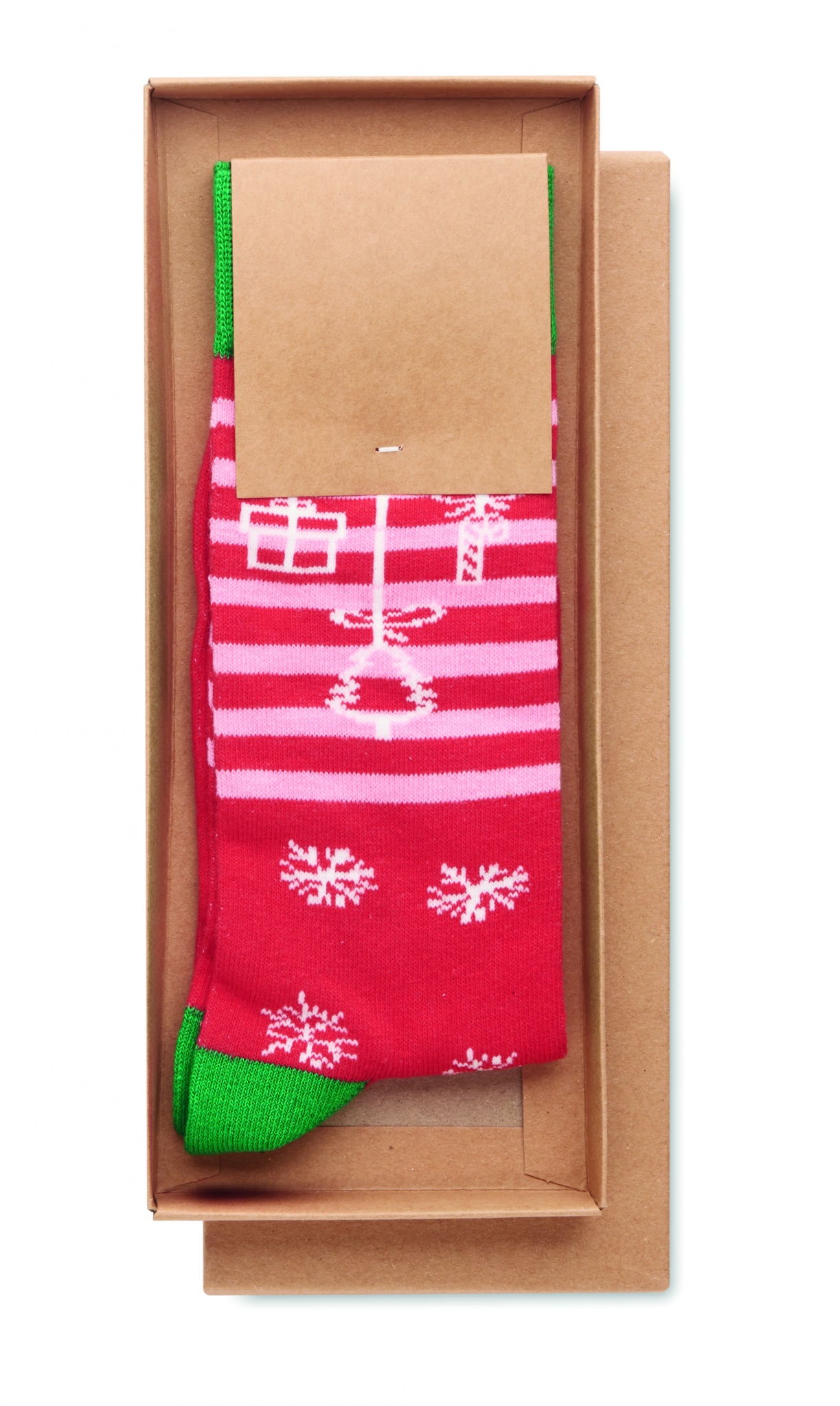 Ett par julstrumpor i 75 % bomull, 23 % RPET-polyester och 2 % spandex. Levereras i presentförpackning. Storlek L = 43-46.