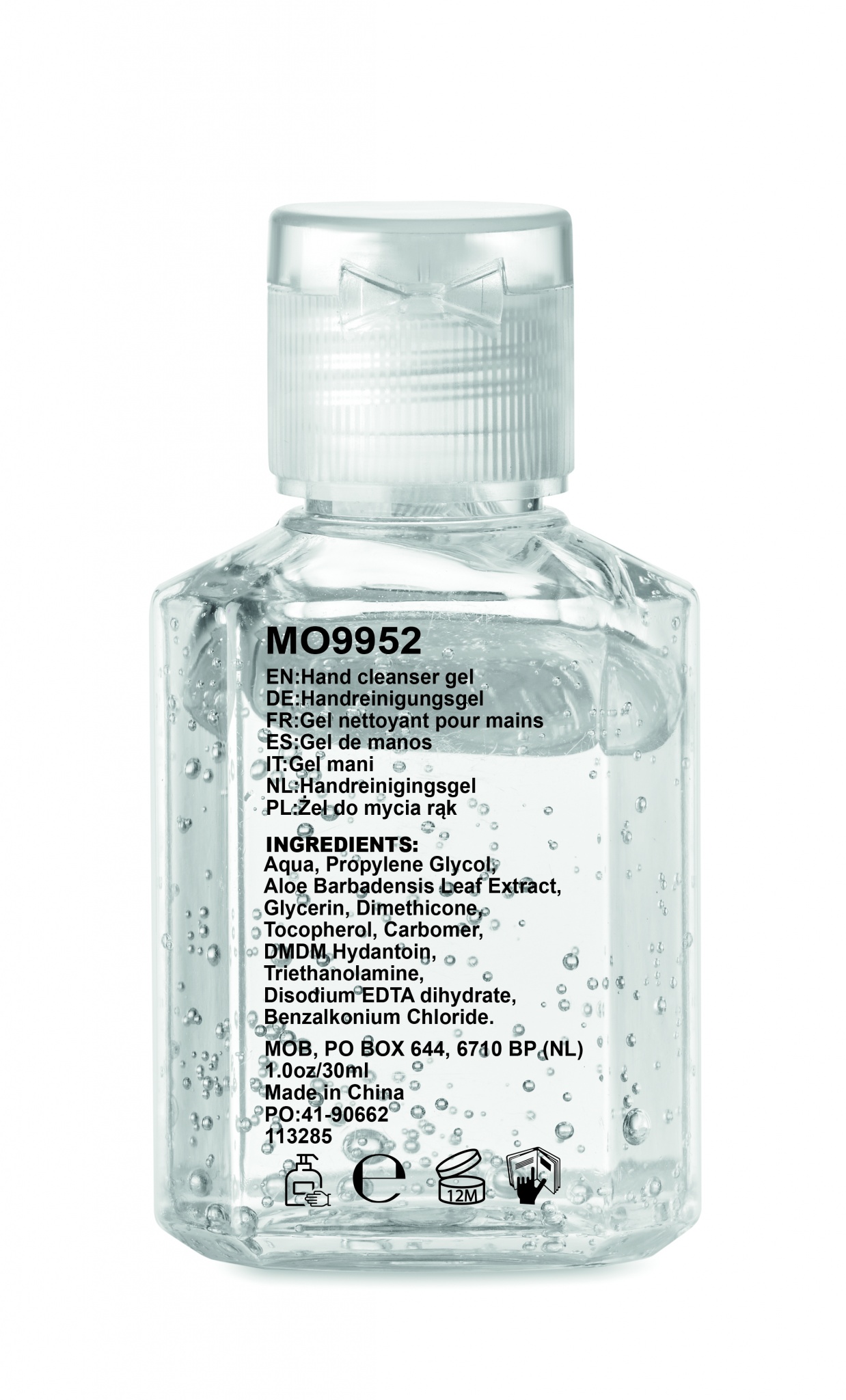 Handrengöringsgel i PET flaska med flip lock. Volym 30ml. Innehåller ingen alkohol. Denna produkt är klassad som kosmetika.
