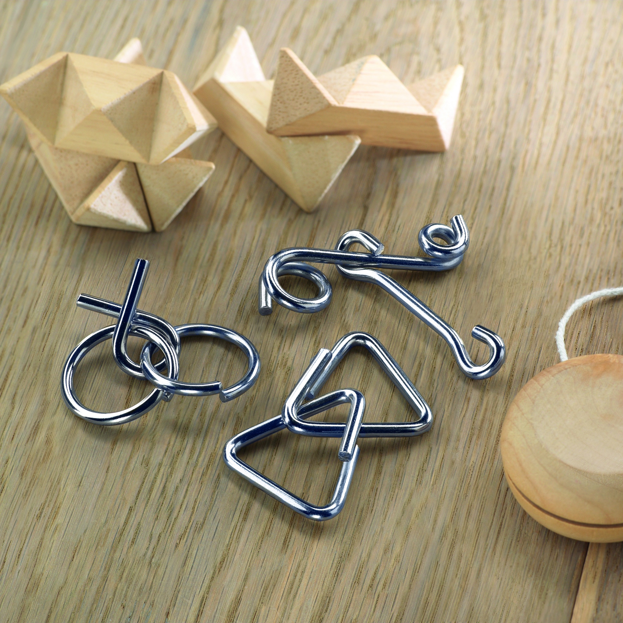 Knep och Knåp set med 3 hjärngympa spel i metall, packade i en bomullspåse.