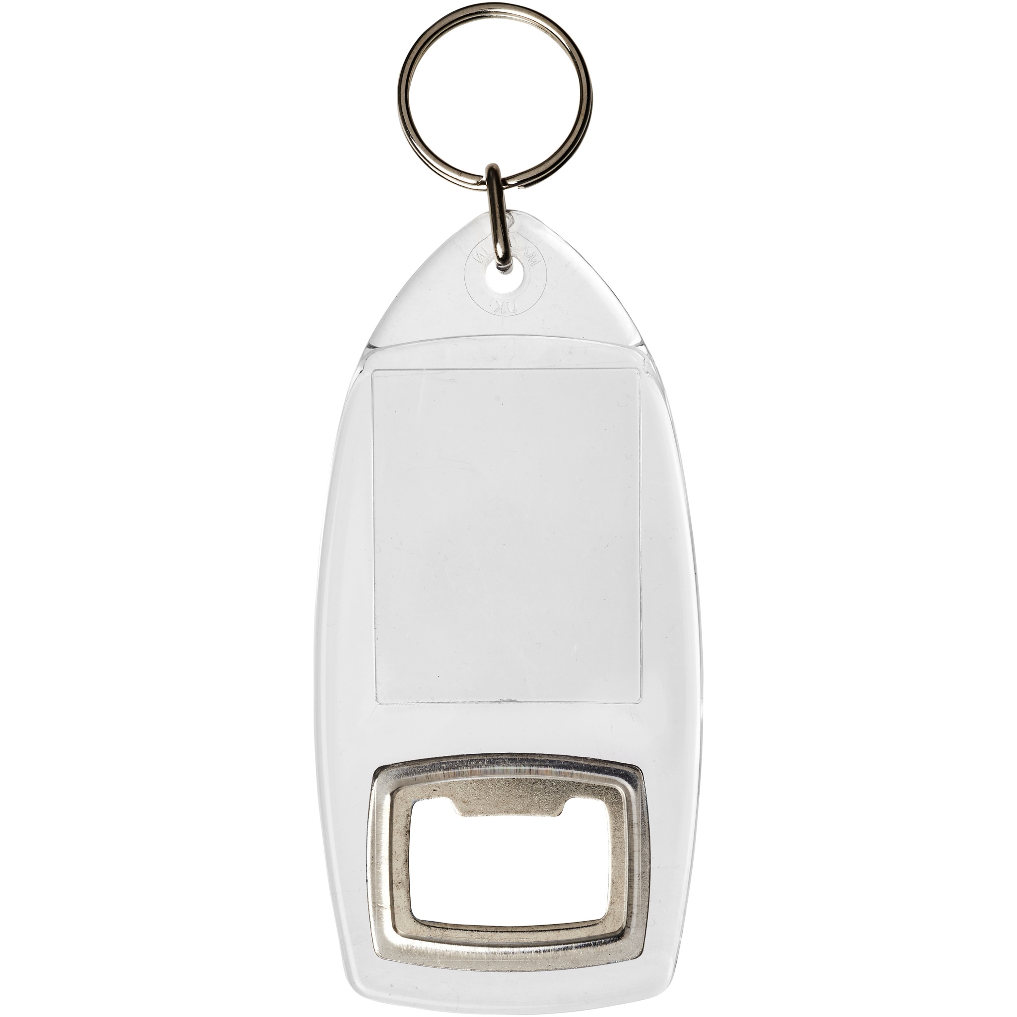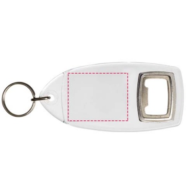 Jibe nyckelring R1 med flasköppnare. Genomskinlig nyckelring R1 med kapsylöppnare och delad metallring. Metallringen har en platt profil som är idealisk för utskick. Tryckinläggets dimensioner: 4,0 cm x 3,2 cm. GPPS-plast.
