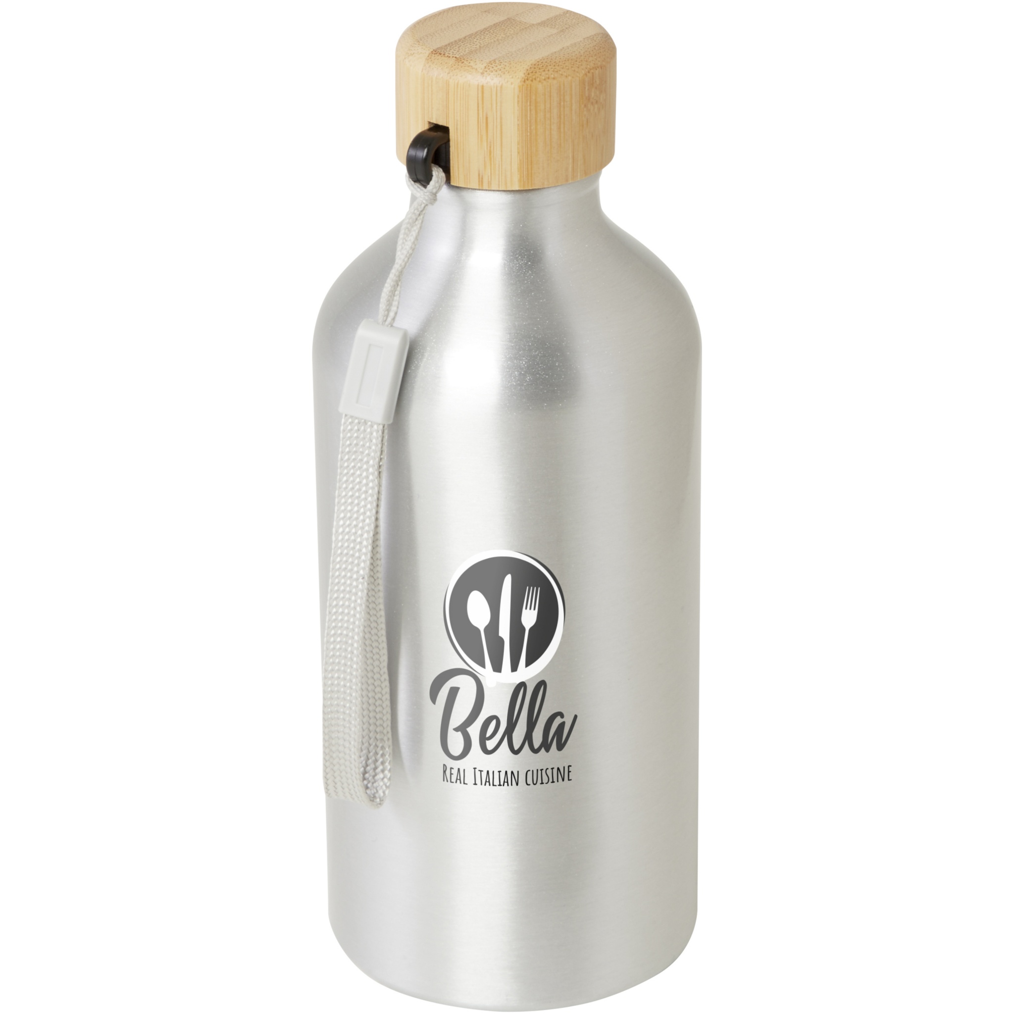 Vattenflaska av RCS-certifierad återvunnen aluminium med ett snyggt lock av bambu. Denna lätta flaska med enkelvägg levereras med en rem som gör den lätt att bära med sig. Bambun kommer från hållbara, miljömässigt och socialt ansvarsfulla källor. Kapaciteten är 500 ml. Endast handdisk.