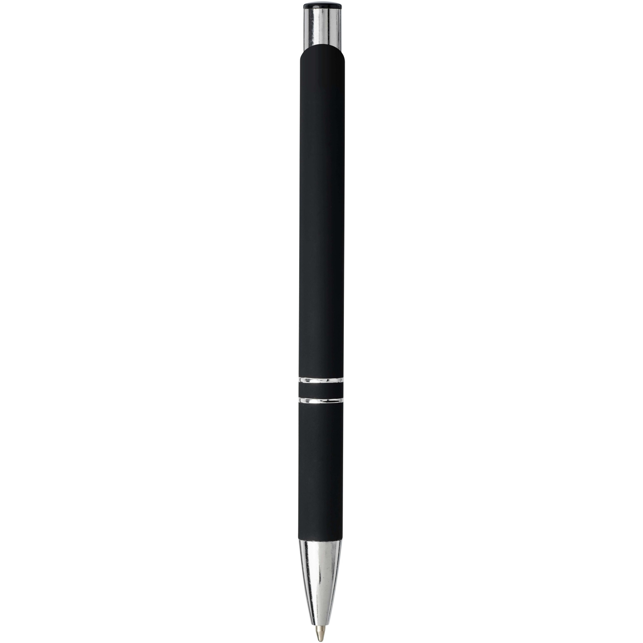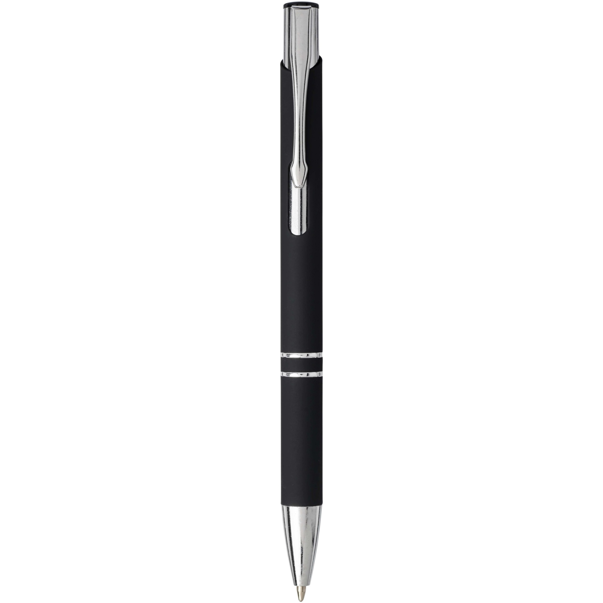 Moneta soft touch kulspetspenna. Gummibeläggningen gör pennan mjuk att hålla i och när den väl är lasergraverad syns pennans undre skikt i silver. Kulspetspenna med klickmekanism med svart gummibeläggning och utsmyckningar i krom samt topp i svart ABS. Det omfattande och populära Moneta-sortimentet finns i en mängd olika stilar och utföranden. Gummibeläggning, pennkropp i aluminium.