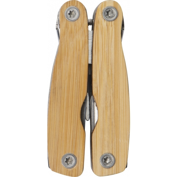 Multifunktionsverktyg av rostfritt stål med bambuskal och olika verktyg som tång, kniv, såg, skruvmejsel, fil etc. Din logotyp kommer att graveras på ena sidan av handtaget.
