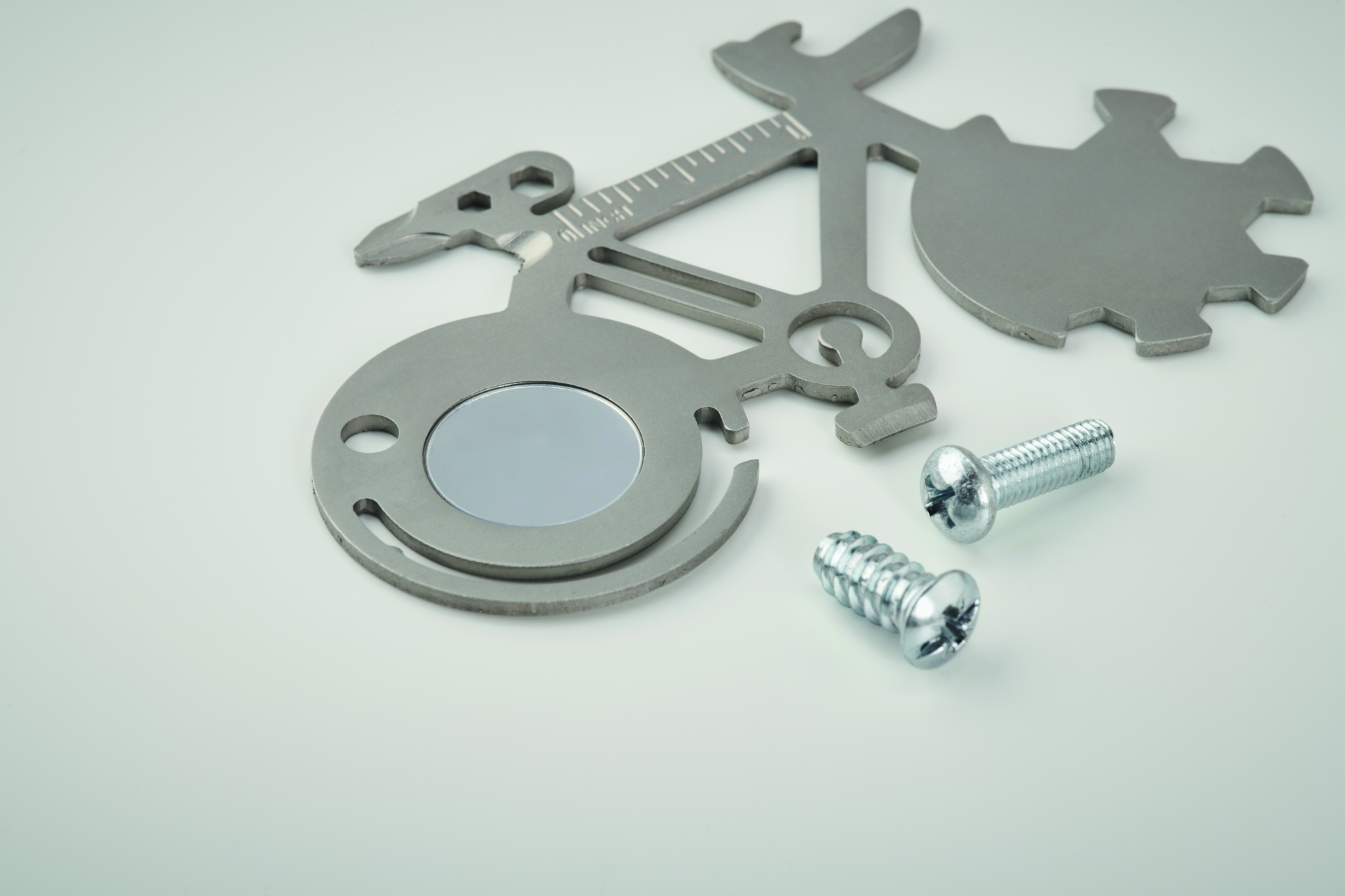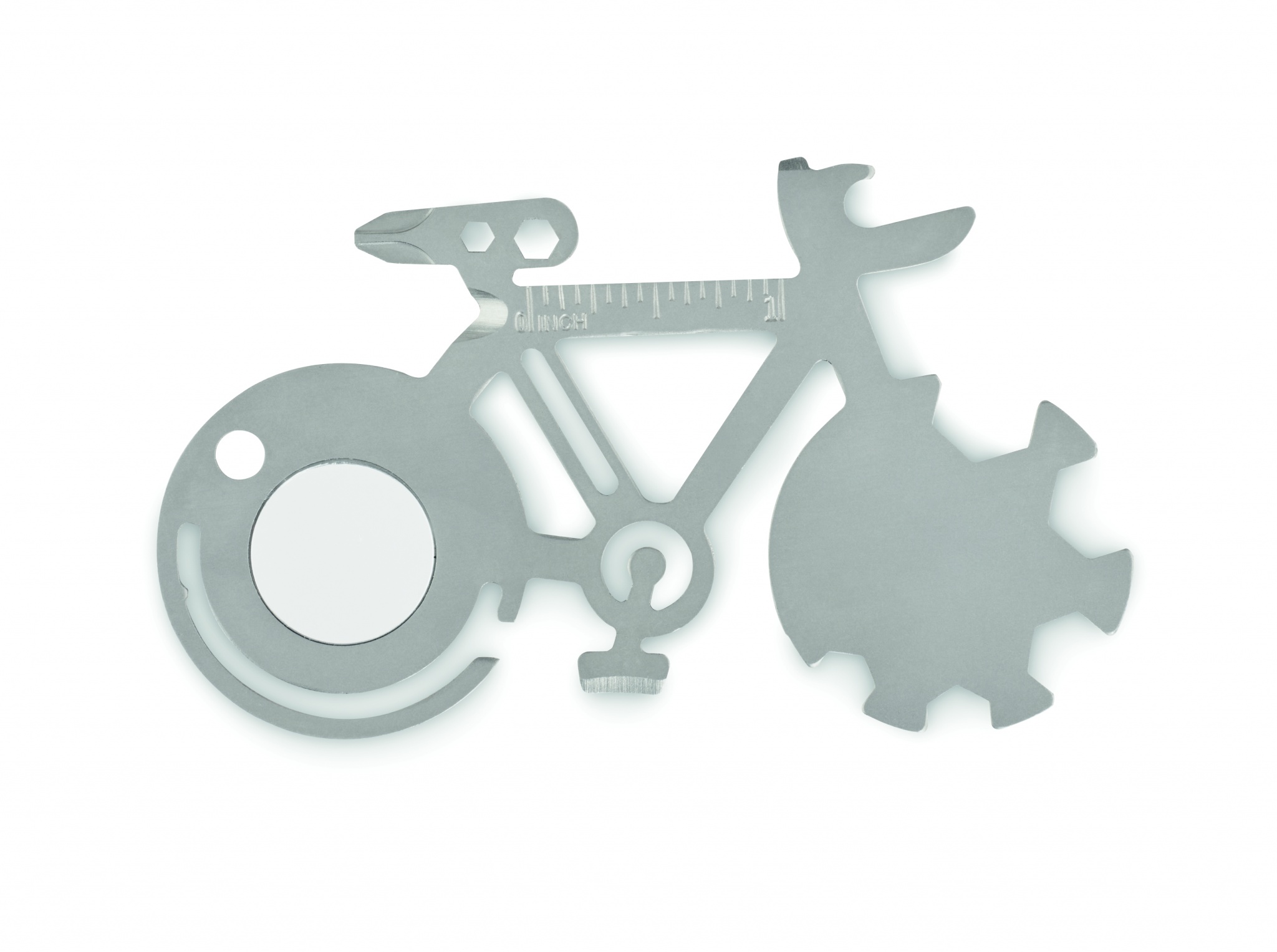 Multiverktyg 11-i-1 i rostfritt stål i cykelform. Från flasköppnare, kniv, linjal eller stjärn-skruvmejselverktyg.