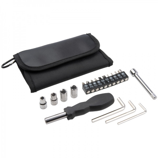 Verktygssetet består av en skruvmejsel med olika muttrar och bits, en förlängningsbit, och tre sexkantnycklar i olika storlekar samt en praktisk påse med karbinhakar där vi trycker din logotyp. Setet är individuellt förpackat i en polybag.