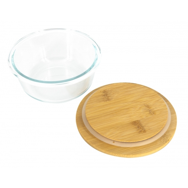 Universalskål av borosilikatglas med säkert stängande bambulock och en påfyllningskapacitet på 300 ml. Din logotyp kommer att graveras på locket.