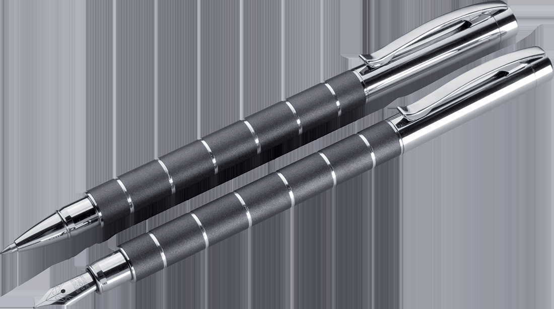 Skrivset bestående av ett högkvalitativt fodral med flik, en kulspetspenna med en stor svart plastpåfyllning och en reservoarpenna. Din logotyp kommer att laseras på båda skrivinstrumenten. Laserpris för båda skrivredskapen.