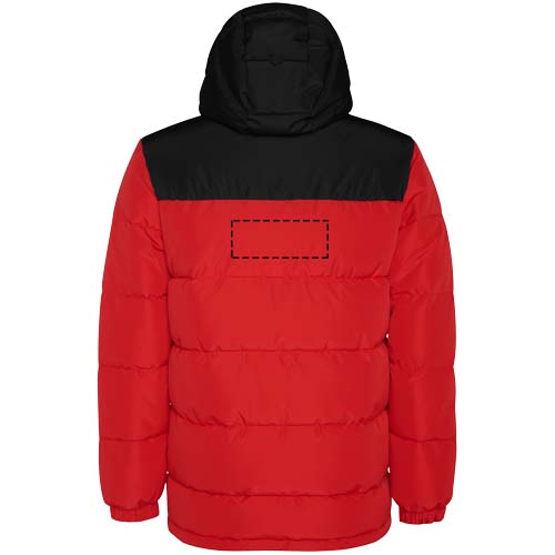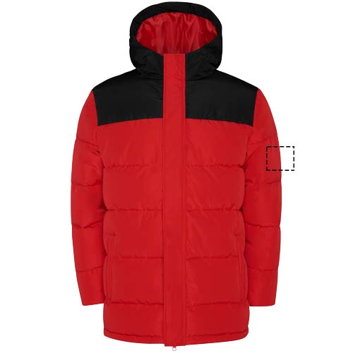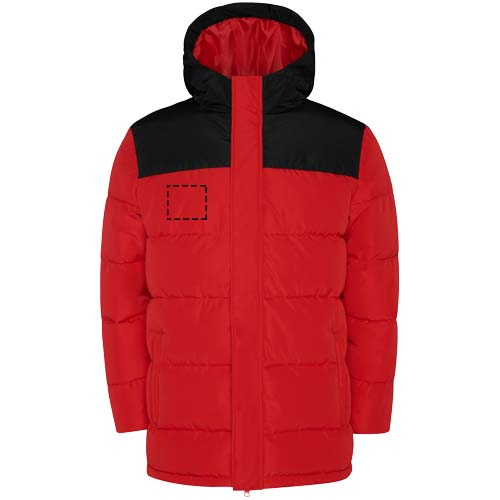 Vadderad jacka med fast huva. Dragkedja fram som täcks av en knäppning. Hakskydd. Två sidofickor med dragkedja. Elastiska muddar.