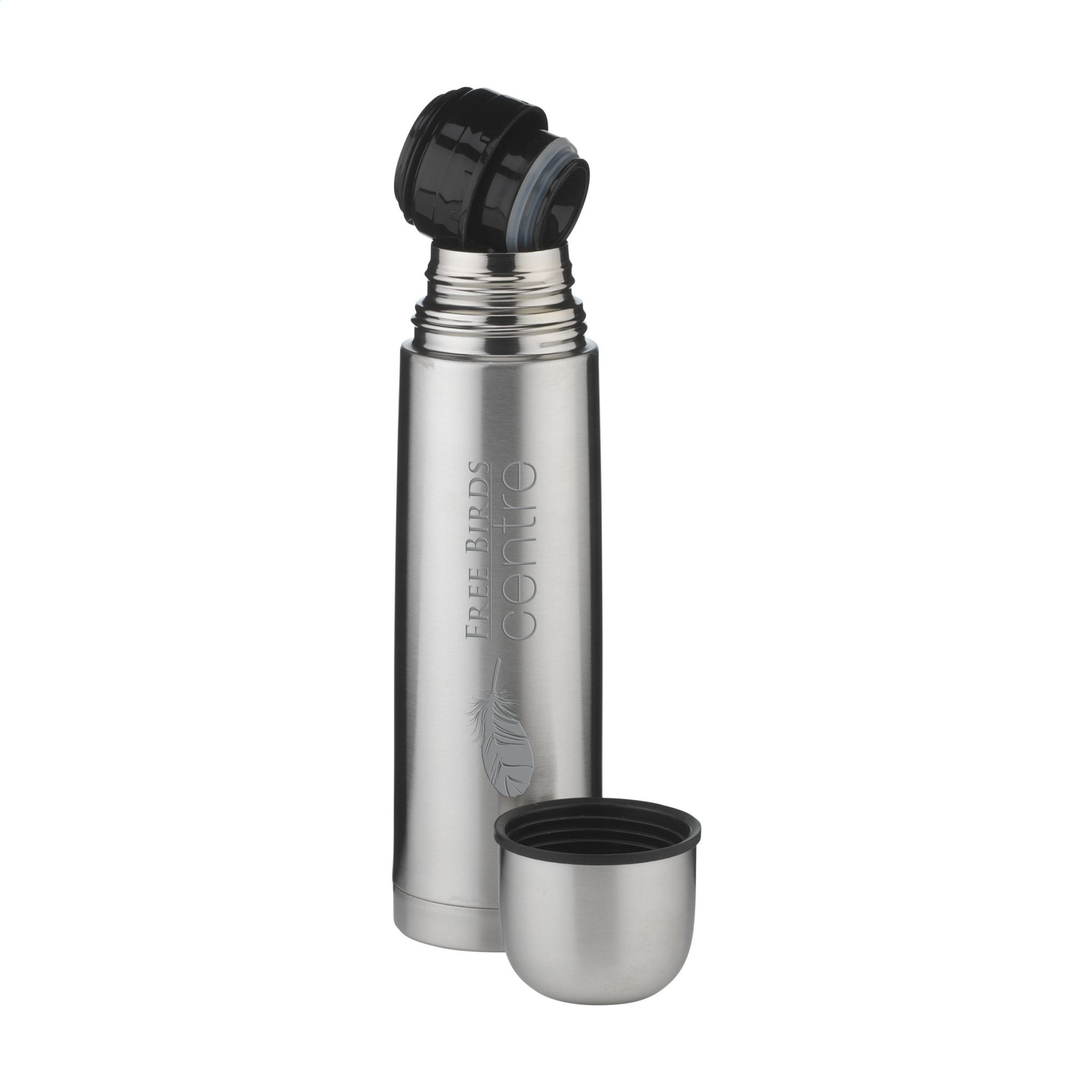 Dubbelväggig, vakuumisolerad termoflaska i rostfritt stål. Extremt hållbar och okrossbar. Vakuumet mellan väggarna isolerar innehållet och håller drycker varma eller kalla under en längre tid. Med skruvlock/drickskopp och praktiskt push-pour system. Läcksäker. Kapacitet 500 ml. Varje föremål är individuellt förpackad.